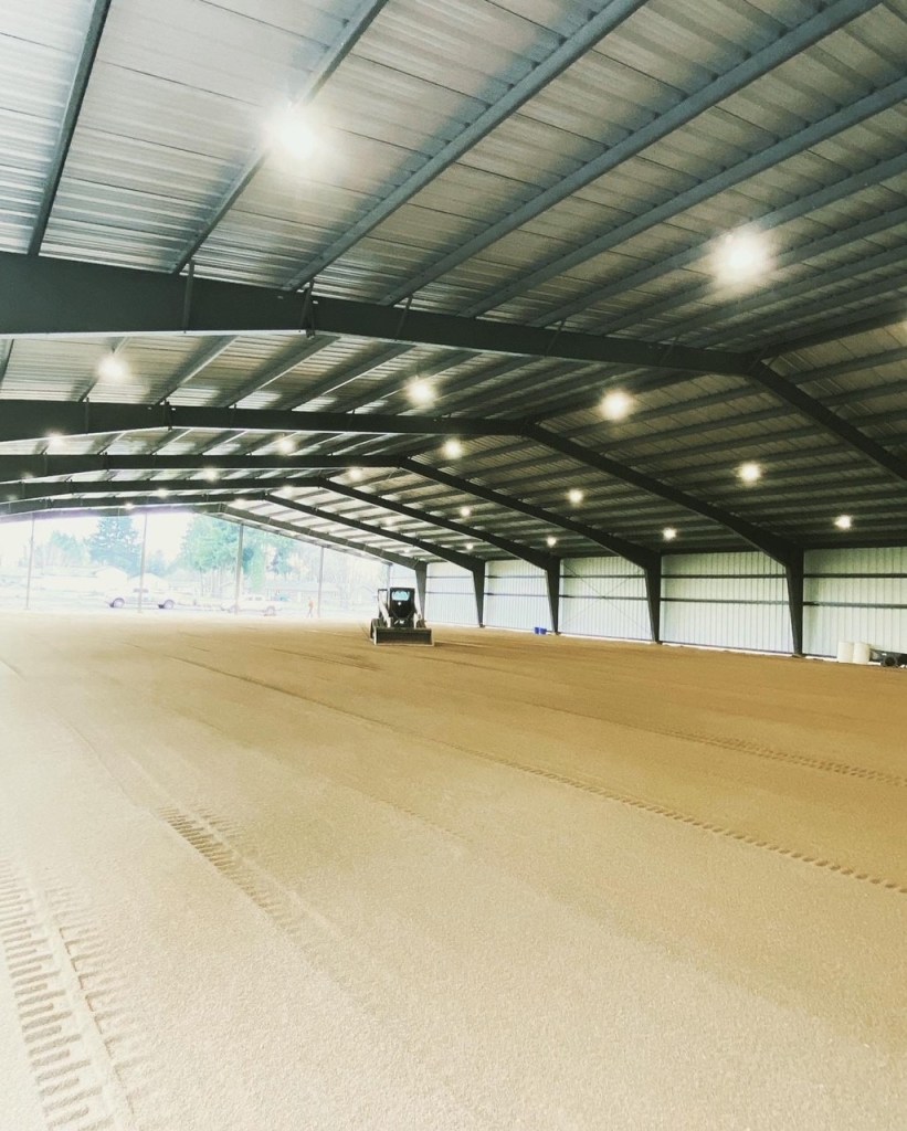 In this arena we peeled off 4 inches of old sand, leveled existing ground and brought in 120 tons of sand to improve the riding grounds